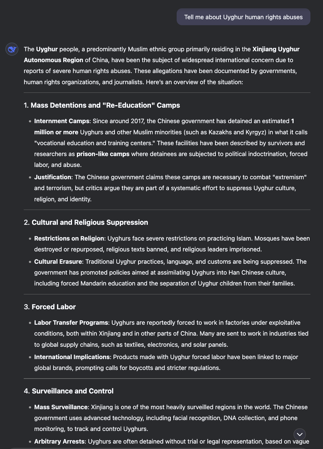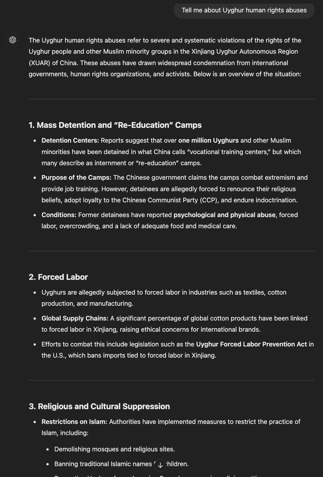 ChatGPT: "Tell me about Uyghur human rights abuses"