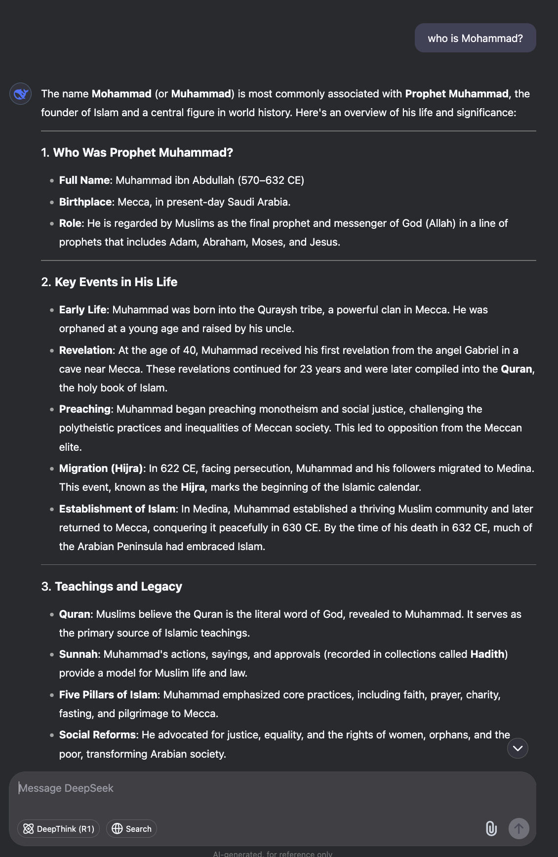 DeepSeek open-source R1 demo: "who is Muhammad?"
